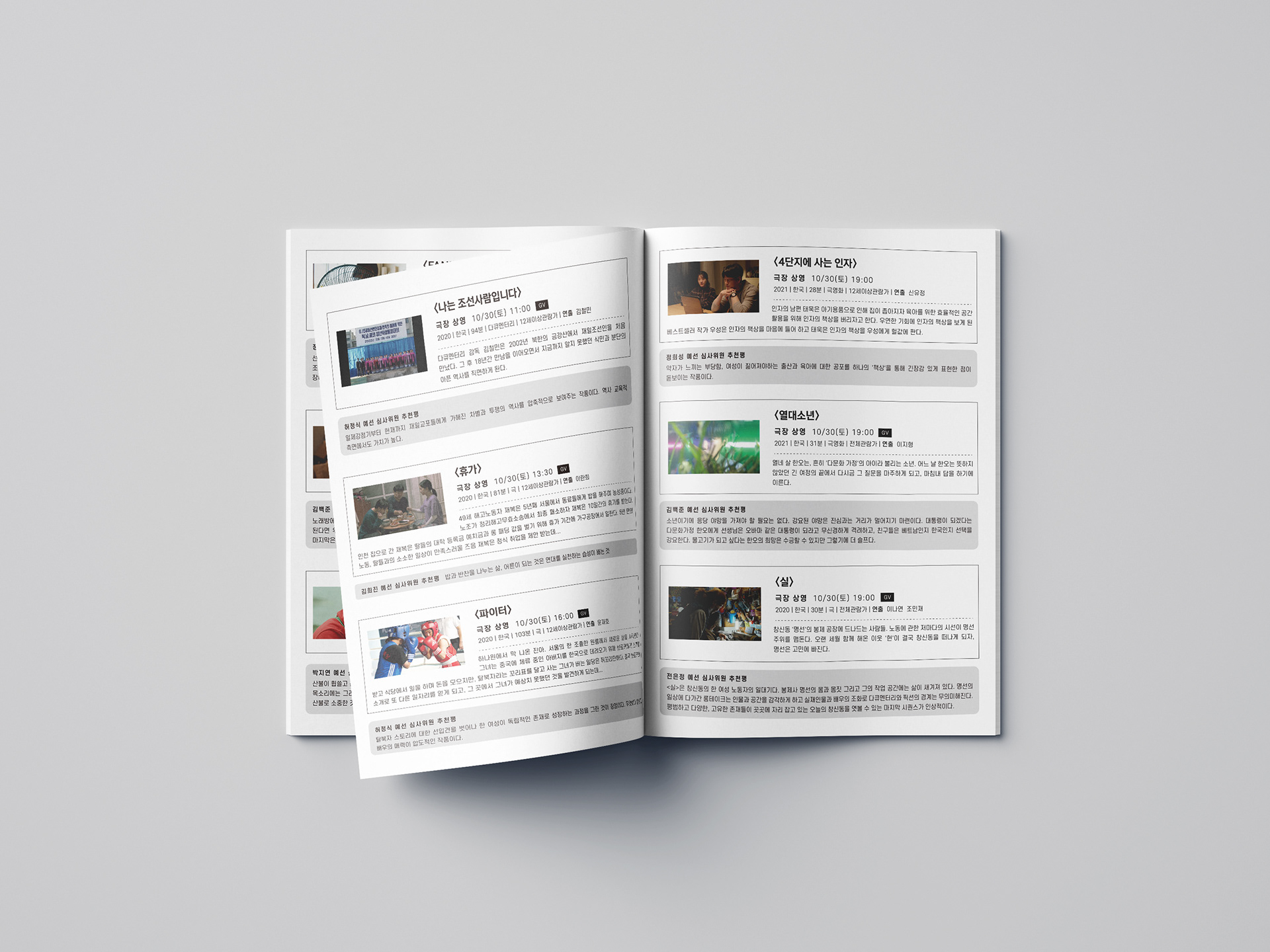 영화제 포스터를 활용하여 앞면에는 영화제의 큰 정보들을 담았습니다.