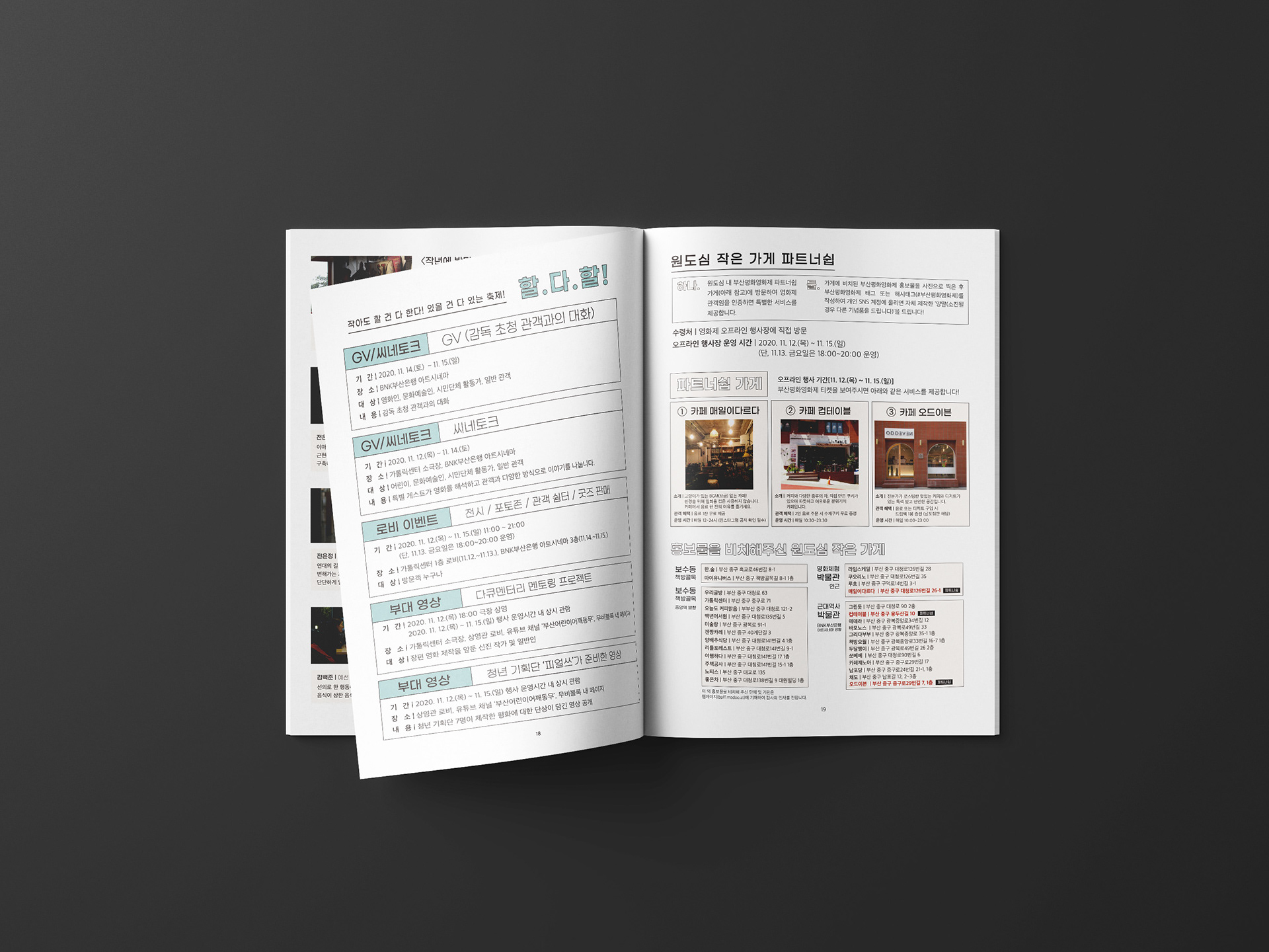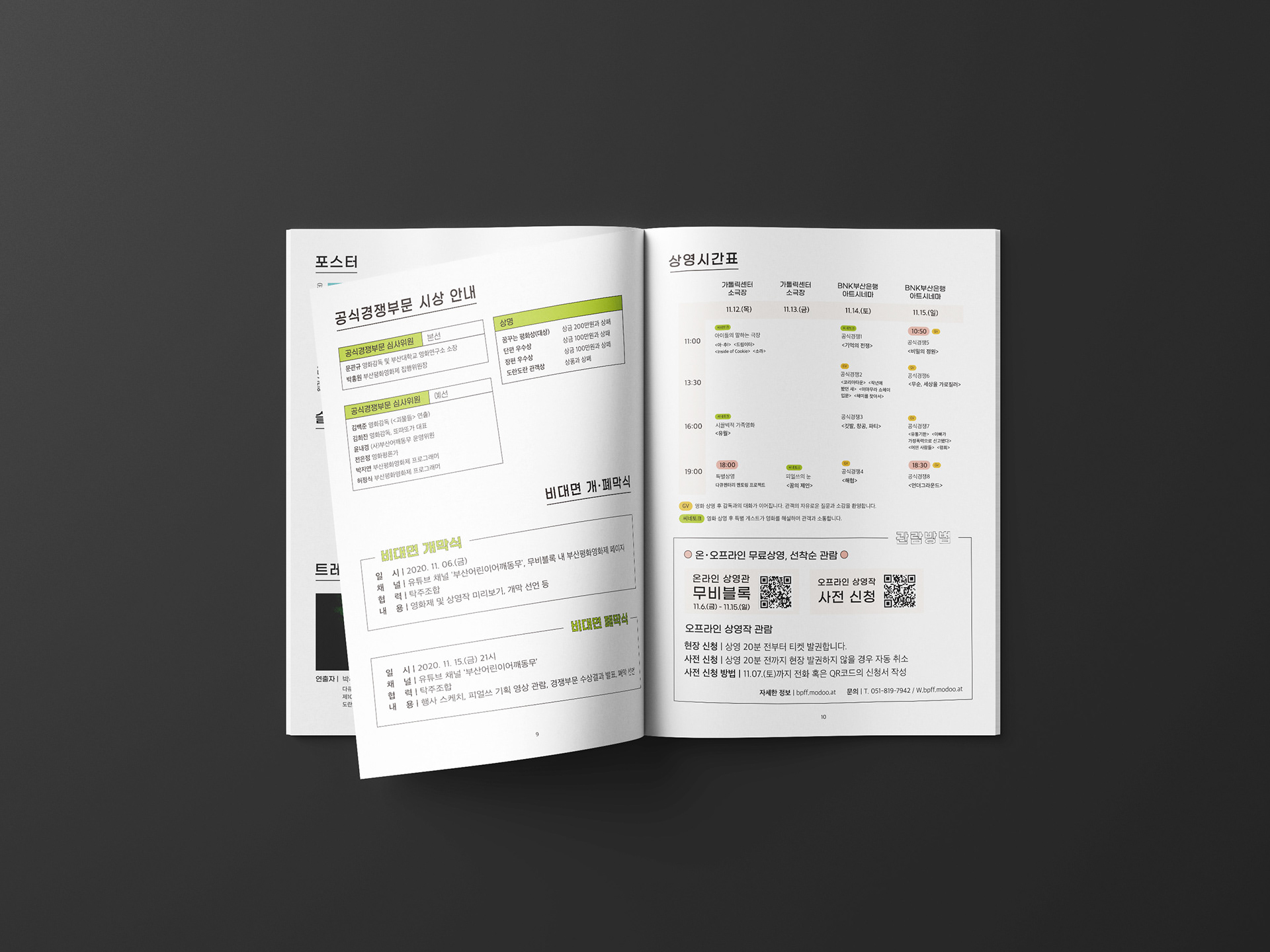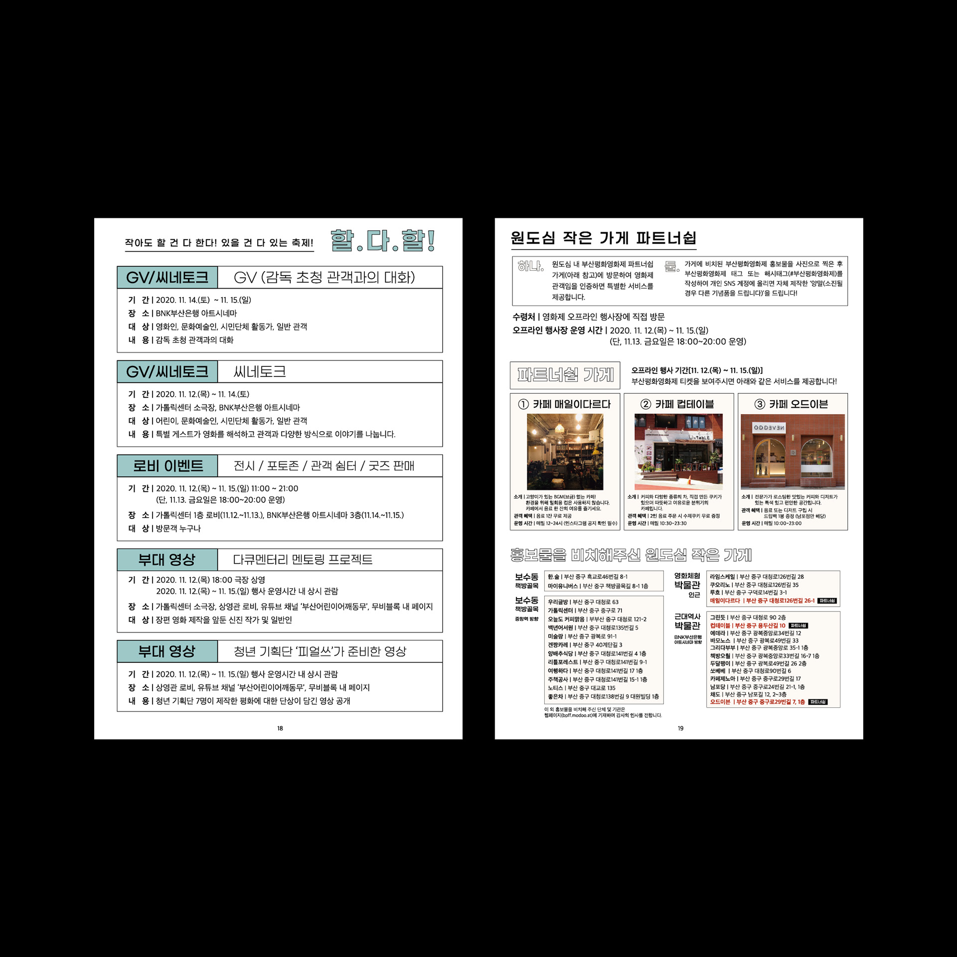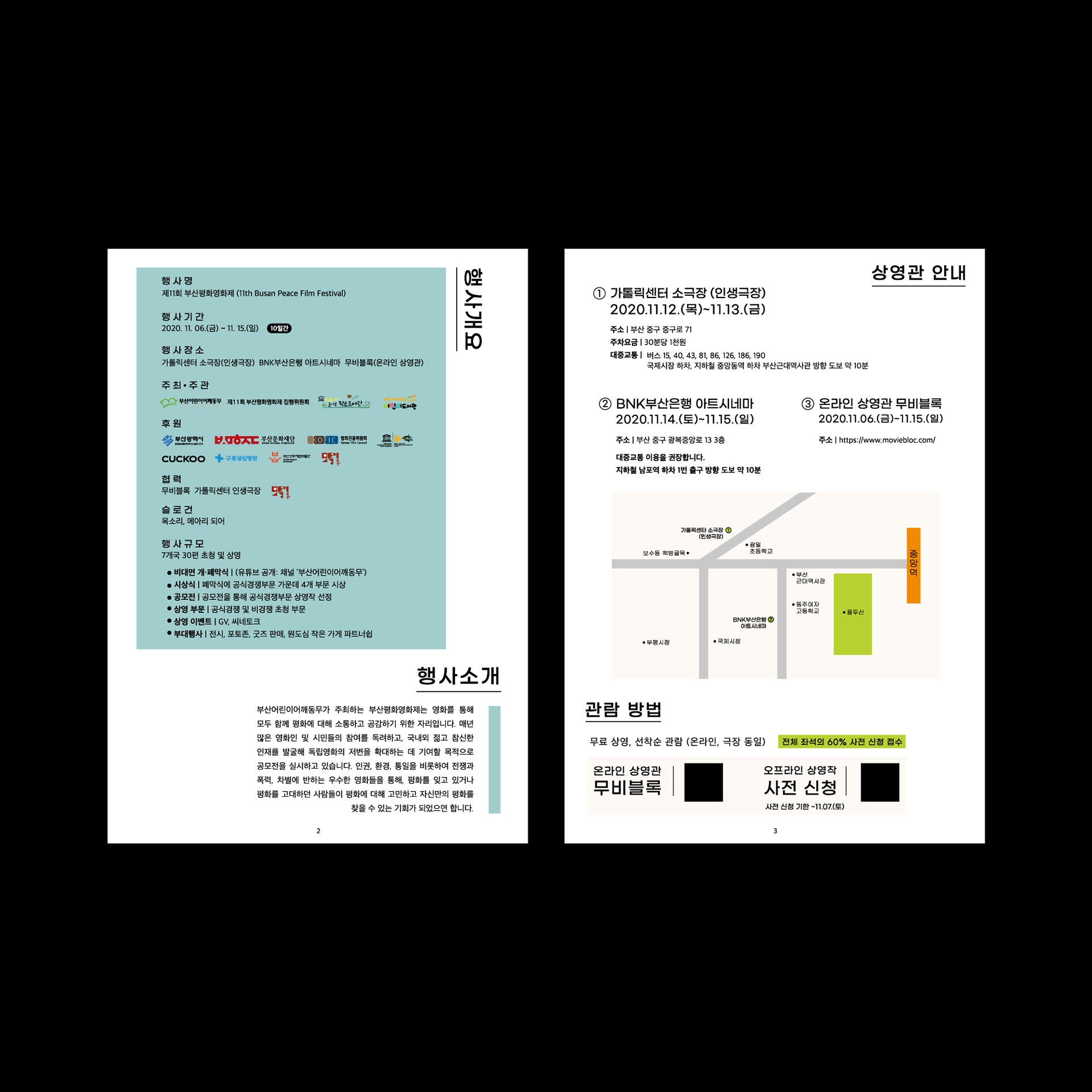 2020년 평화영화제의 상영시간표와 정보가 담긴 브로슈어를 디자인했습니다.