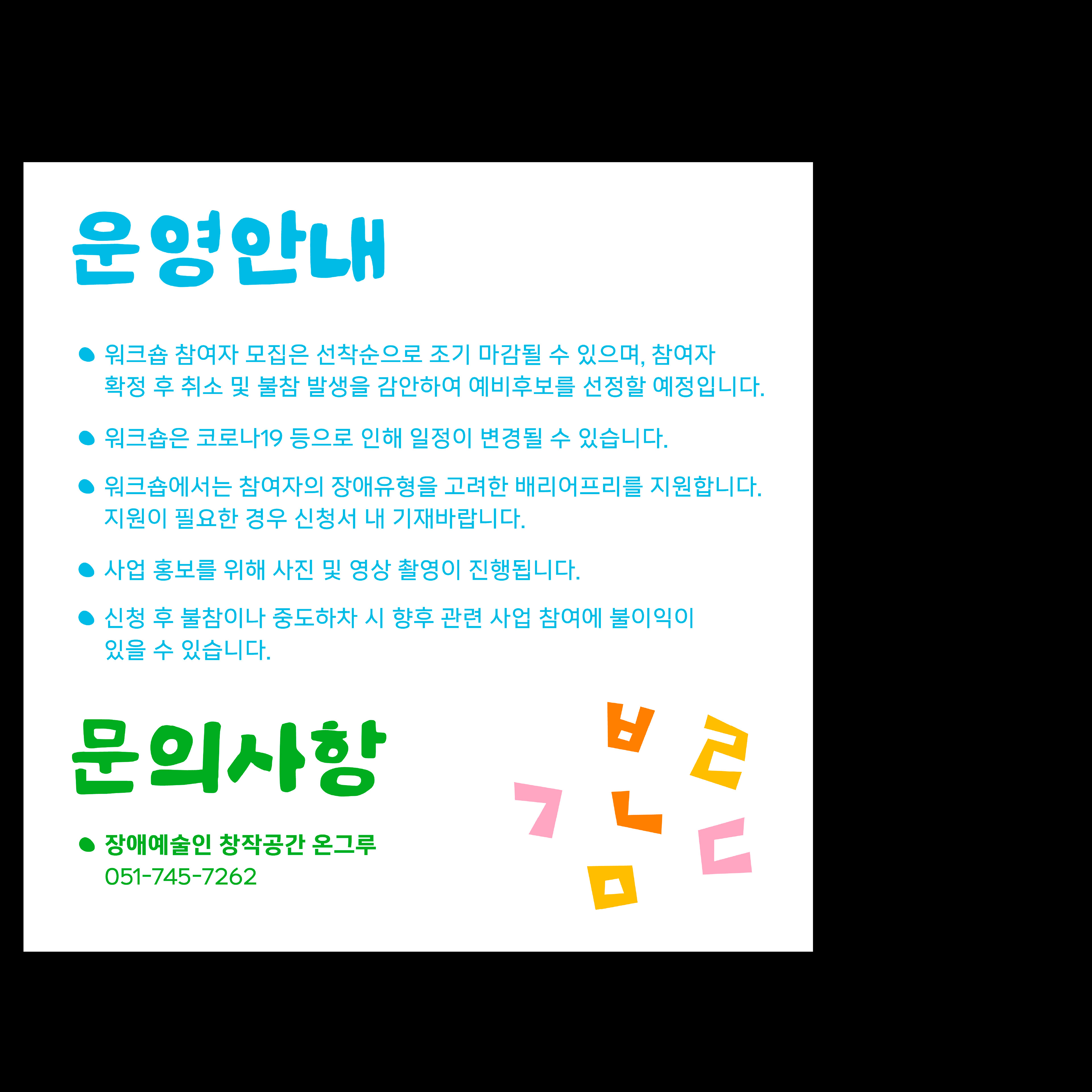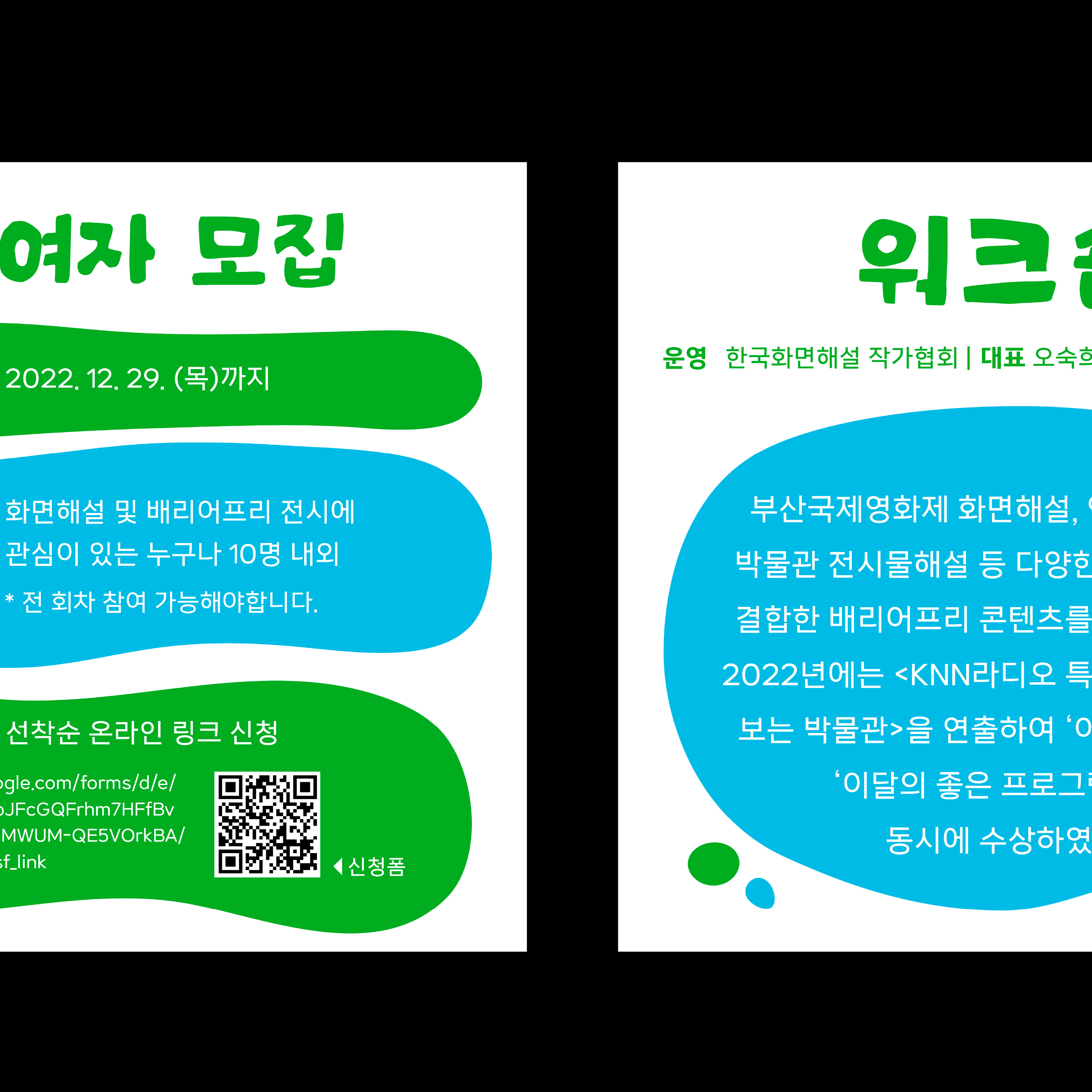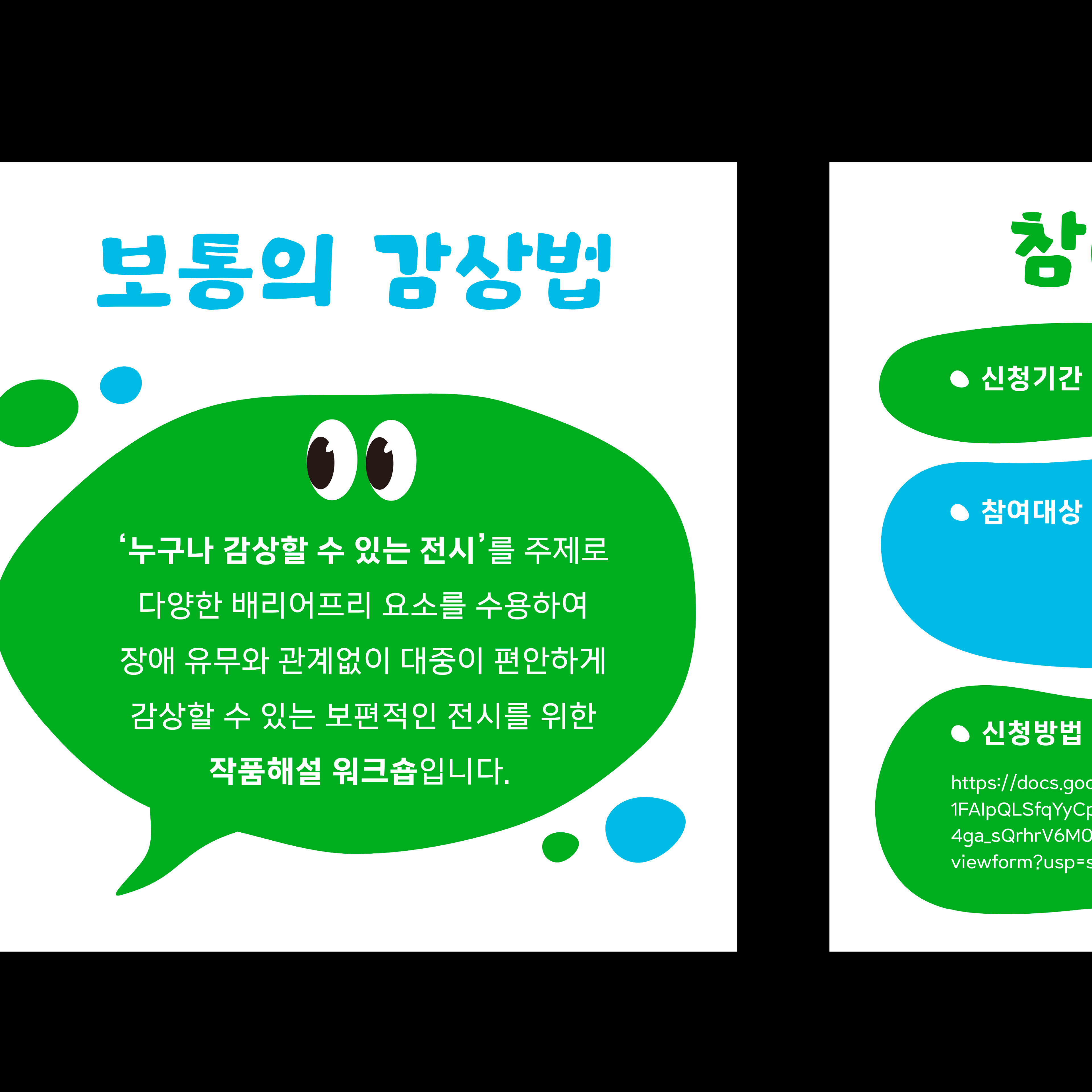 화면 해설 워크숍을 표현할 수 있도록 여러 색색의 말풀선에 눈을 달아 캐릭터화하였습니다.