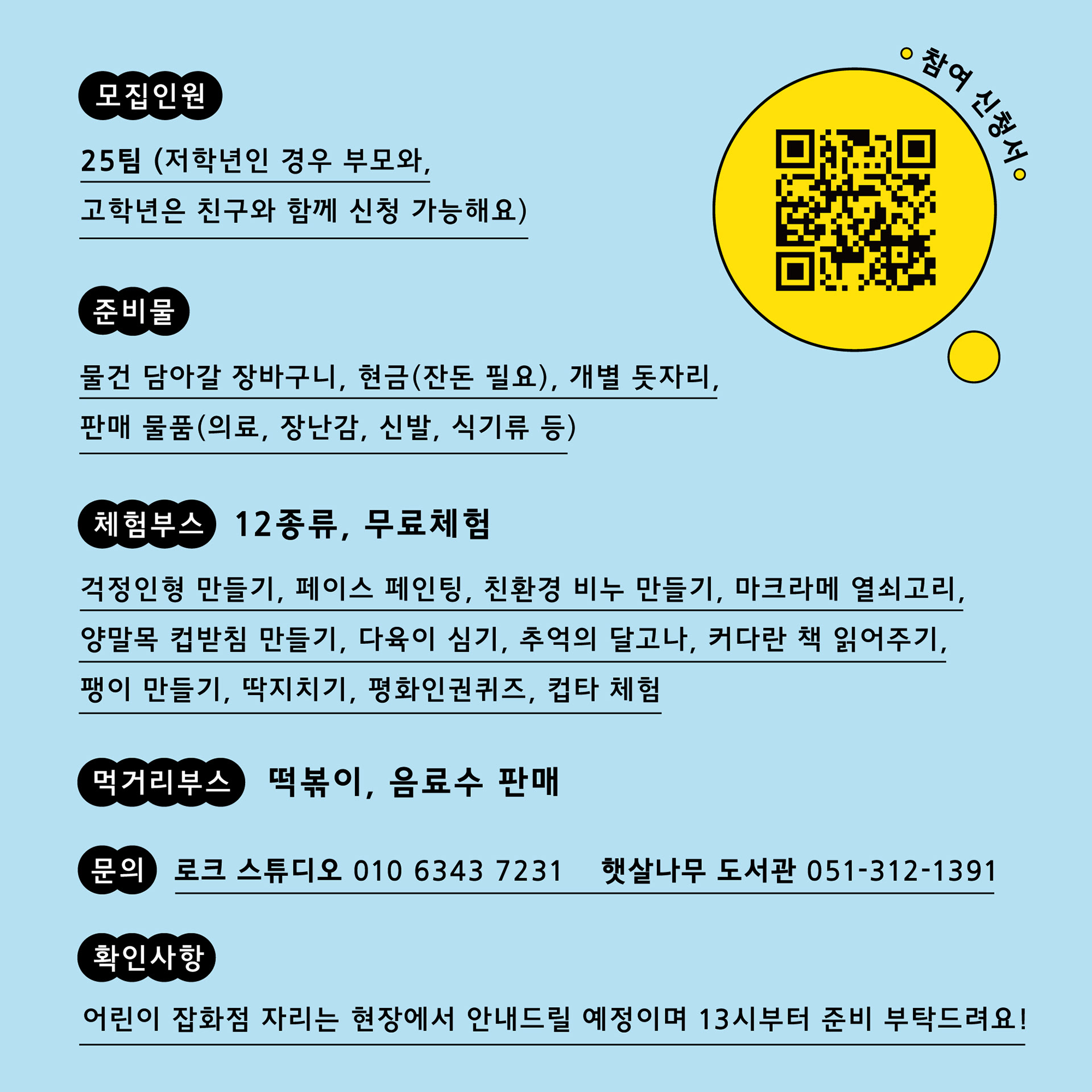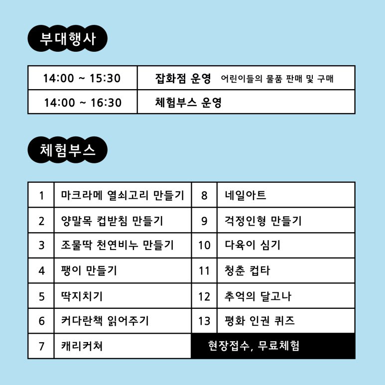 행사는 어린이 잡화점 코너와 어린이 체험 코너 총 2가지로 진행했습니다.