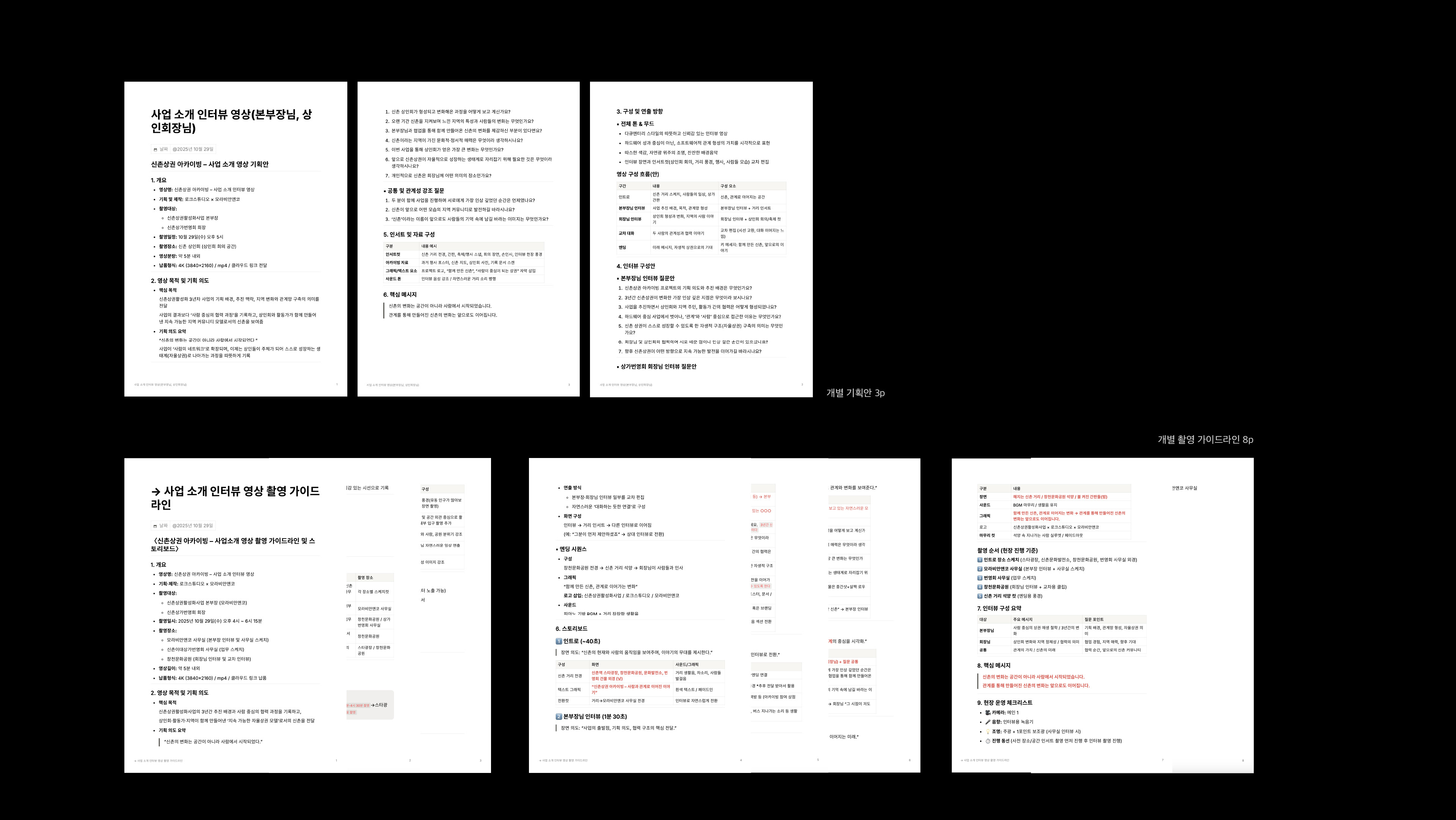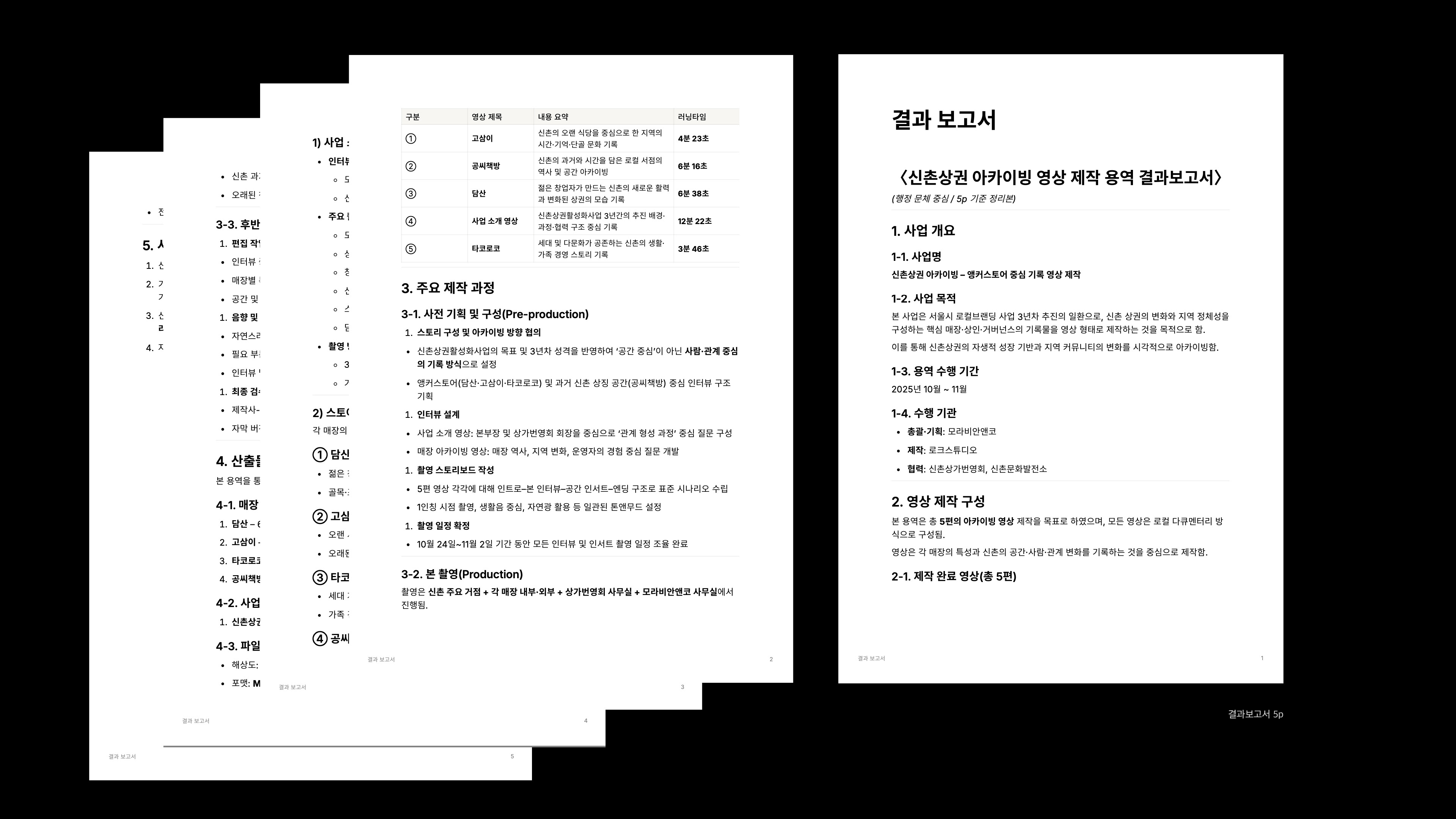 본 프로젝트는 영상 1편 제작에 그치지 않고, 회의 기록 → 전체 기획안 → 개별 기획안 → 촬영 가이드라인 → 편집/납품 → 결과보고서까지, 실제 운영 프로세스를 문서화하여 재현 가능한 제작 시스템으로 정리했습니다.