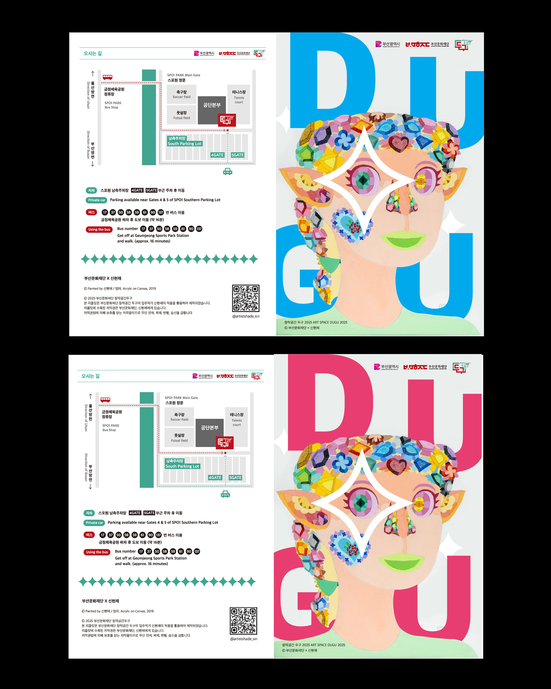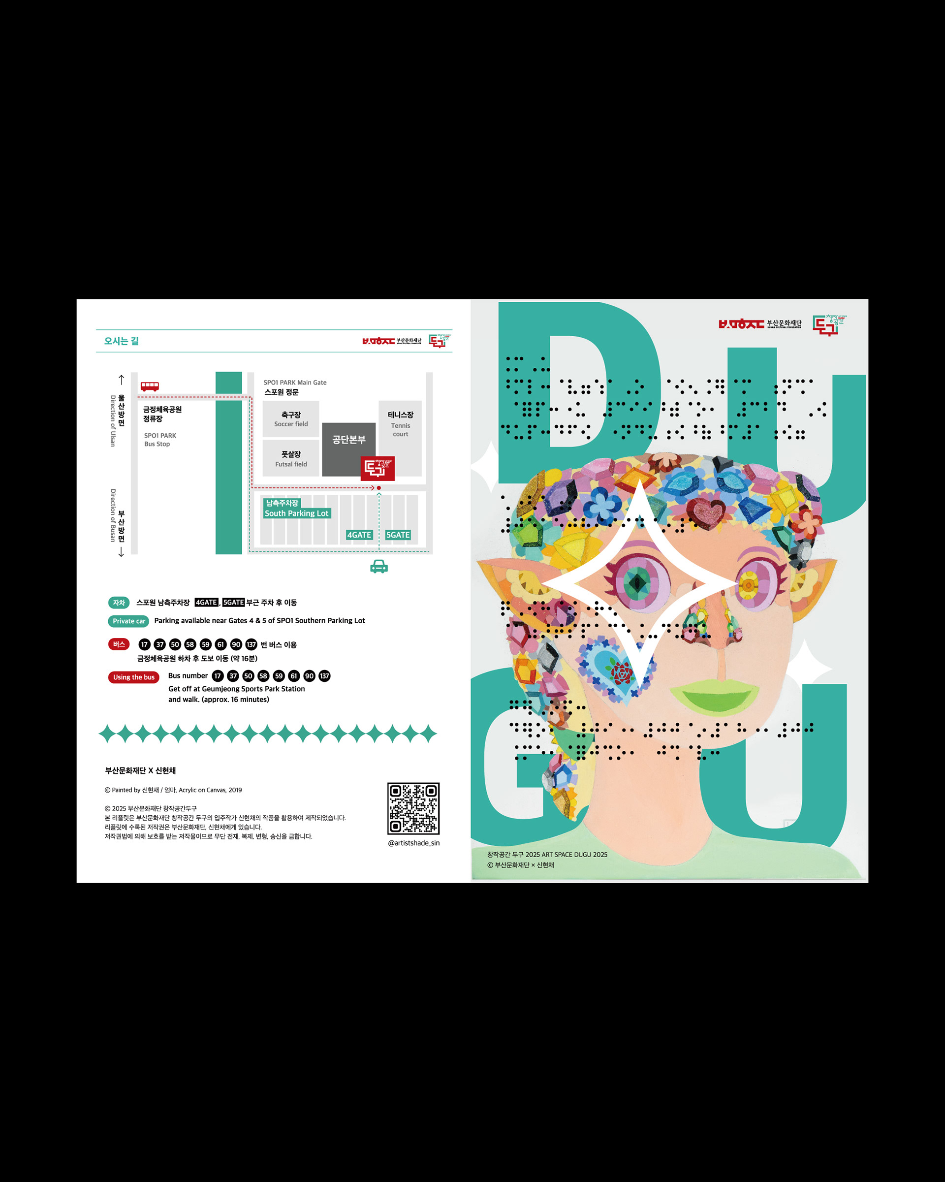 부산문화재단이 운영하는 창작공간 두구(ART SPACE DUGU)의 공간 정체성을 시각적으로 정리하고, 입주 작가 신현채의 작품 세계를 결합한 리플렛(점자 인쇄 포함) 제작 및 굿즈 협업 프로젝트입니다.