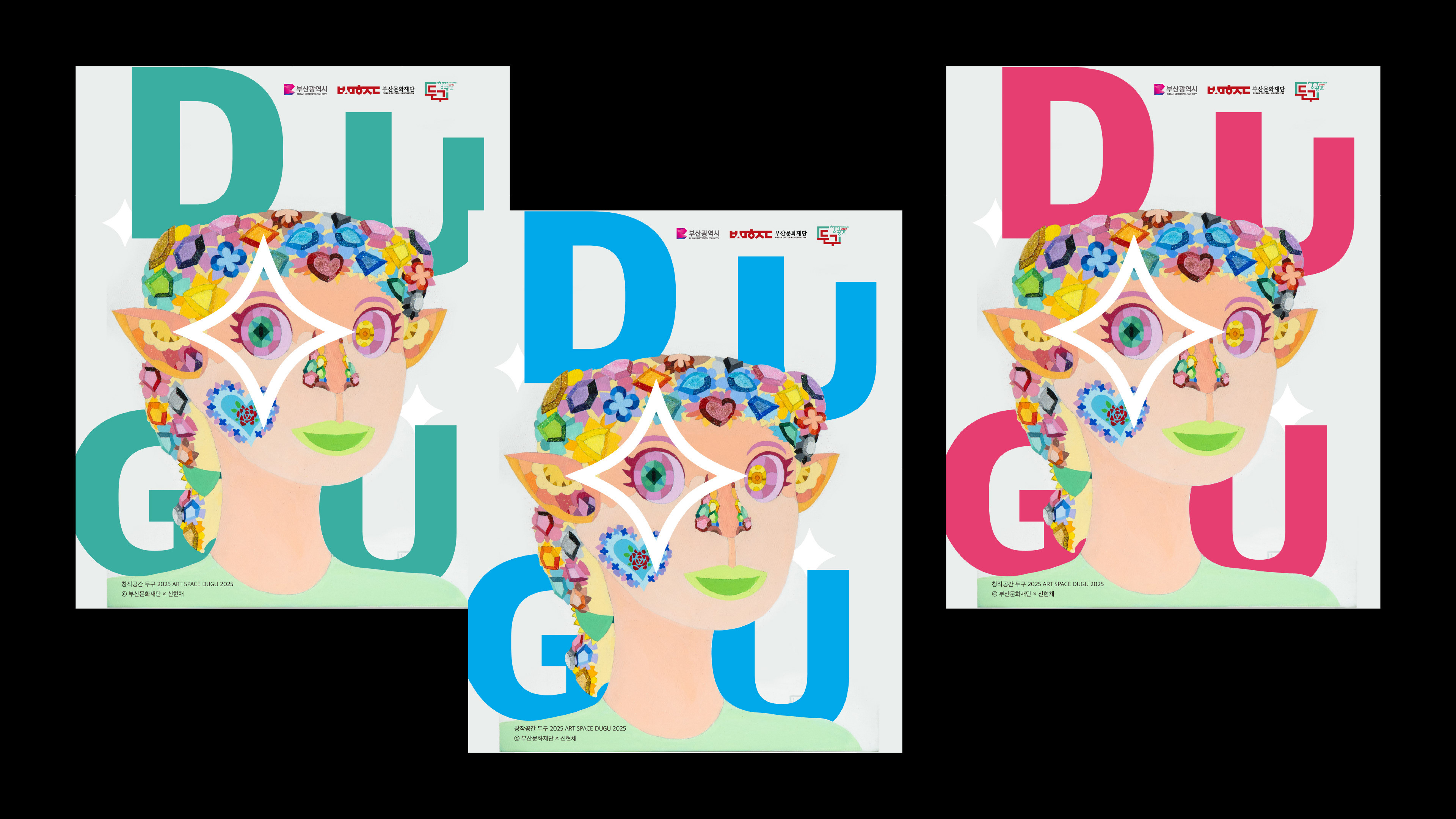 커버의 DUGU(두구) 영문 타이포는 강한 스케일로 배치해 공간의 존재감을 만들고, 그 위에 작가 작품 기반의 콜라주를 얹어 “공간(플랫폼)–작가(콘텐츠)”의 관계가 한 화면에서 읽히도록 구성했습니다.