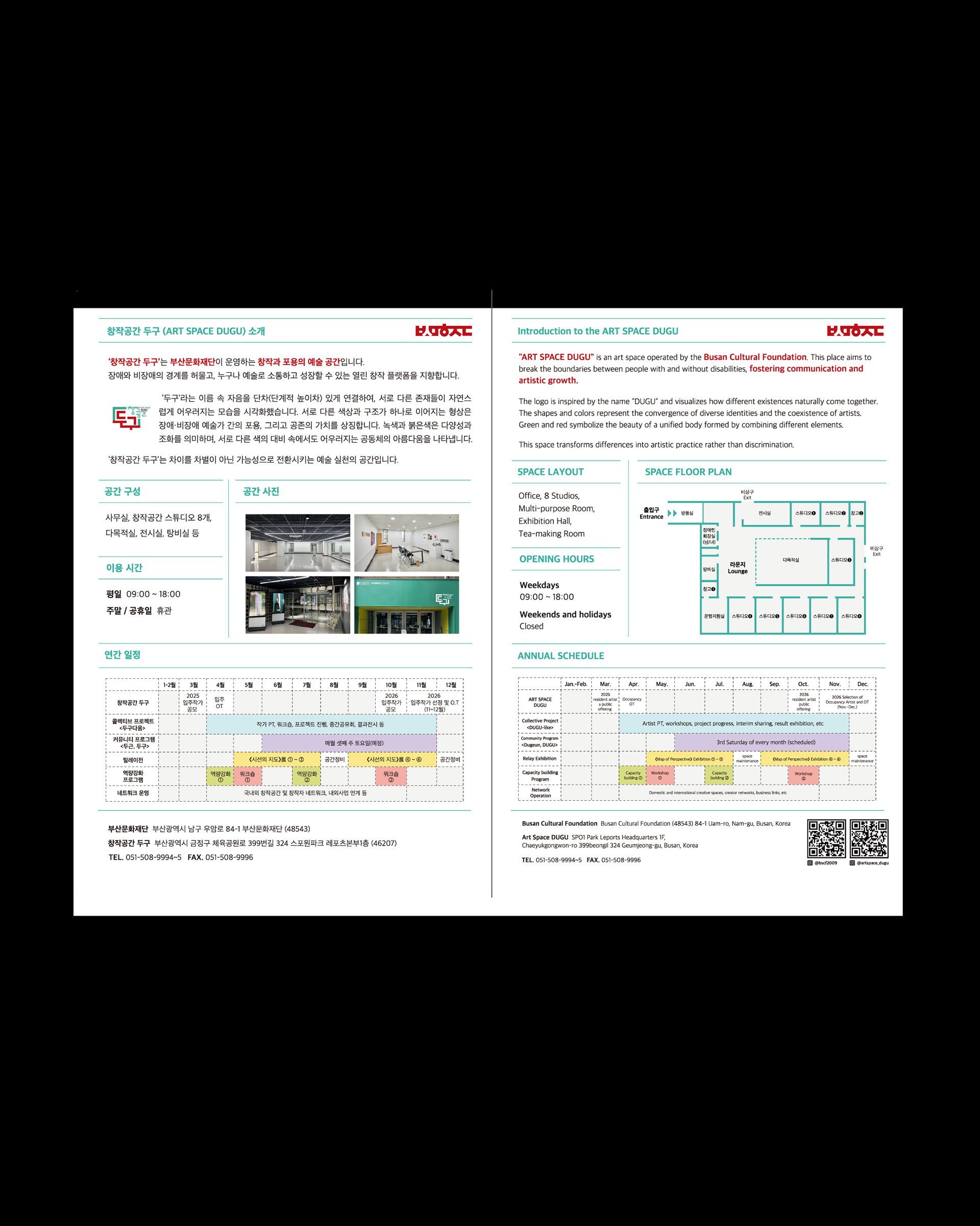 리플렛 내부는 두구 공간의 정보를 국문/영문으로 구조화하여, 방문자/협력자/외부 관객에게 필요한 정보를 빠르게 전달하도록 편집했습니다.