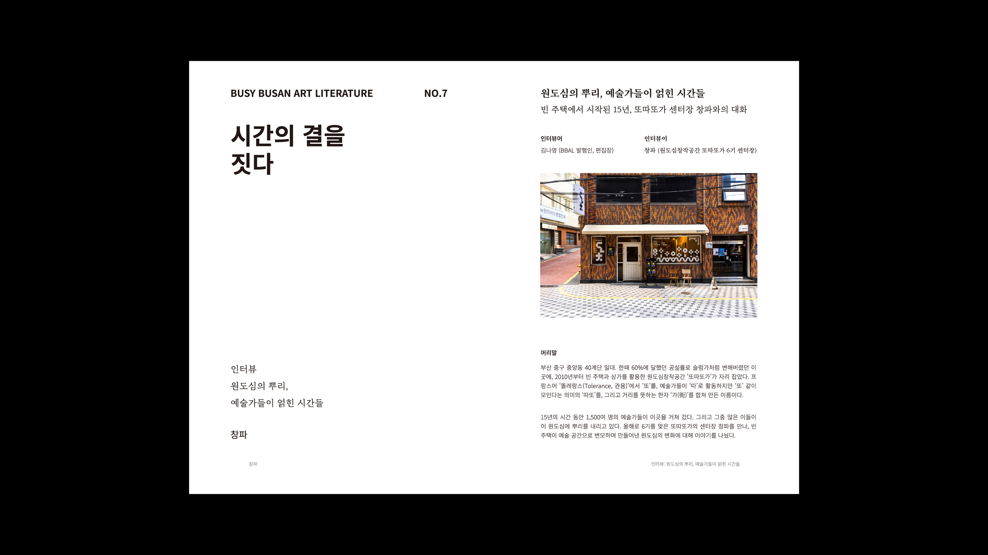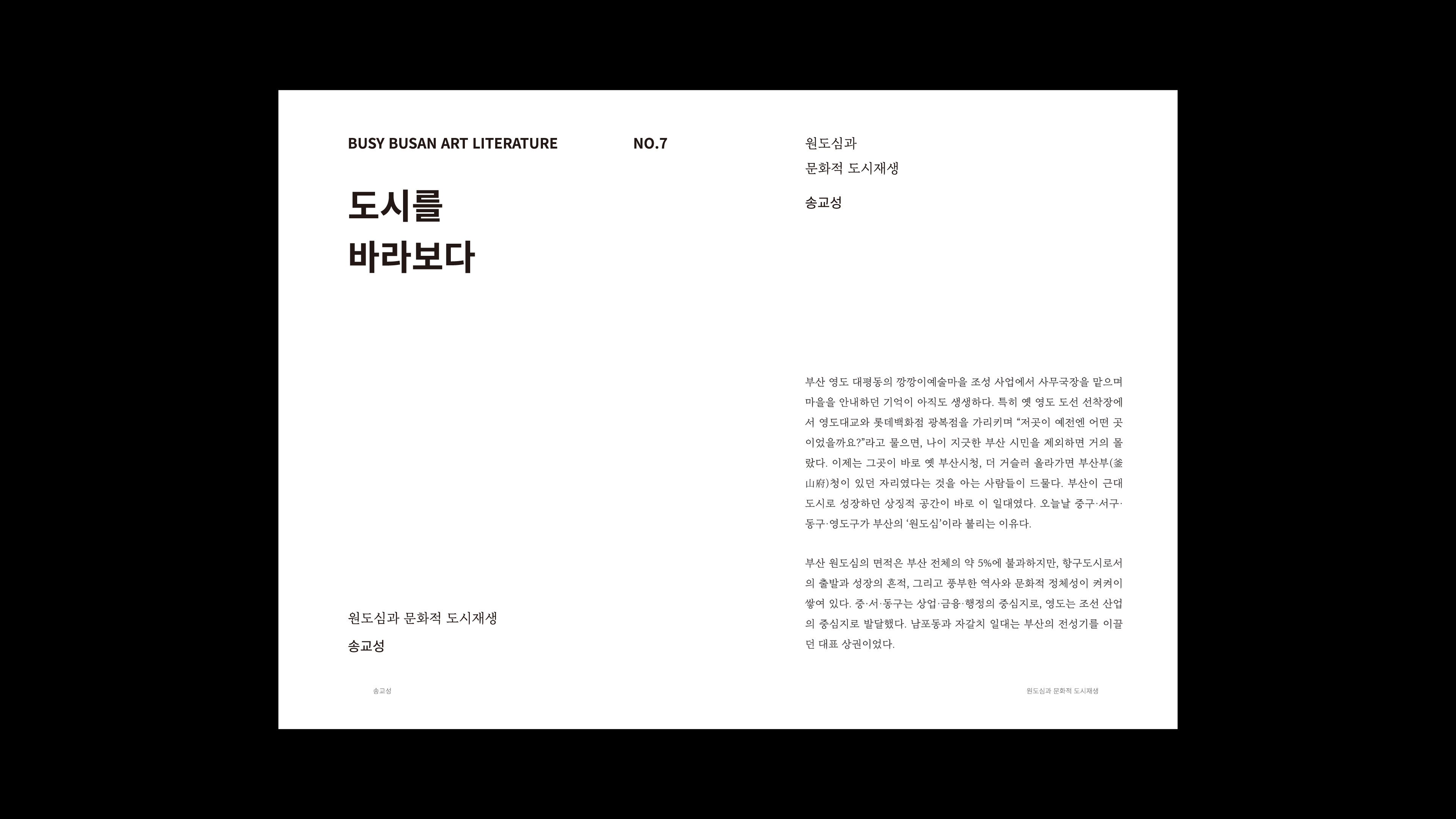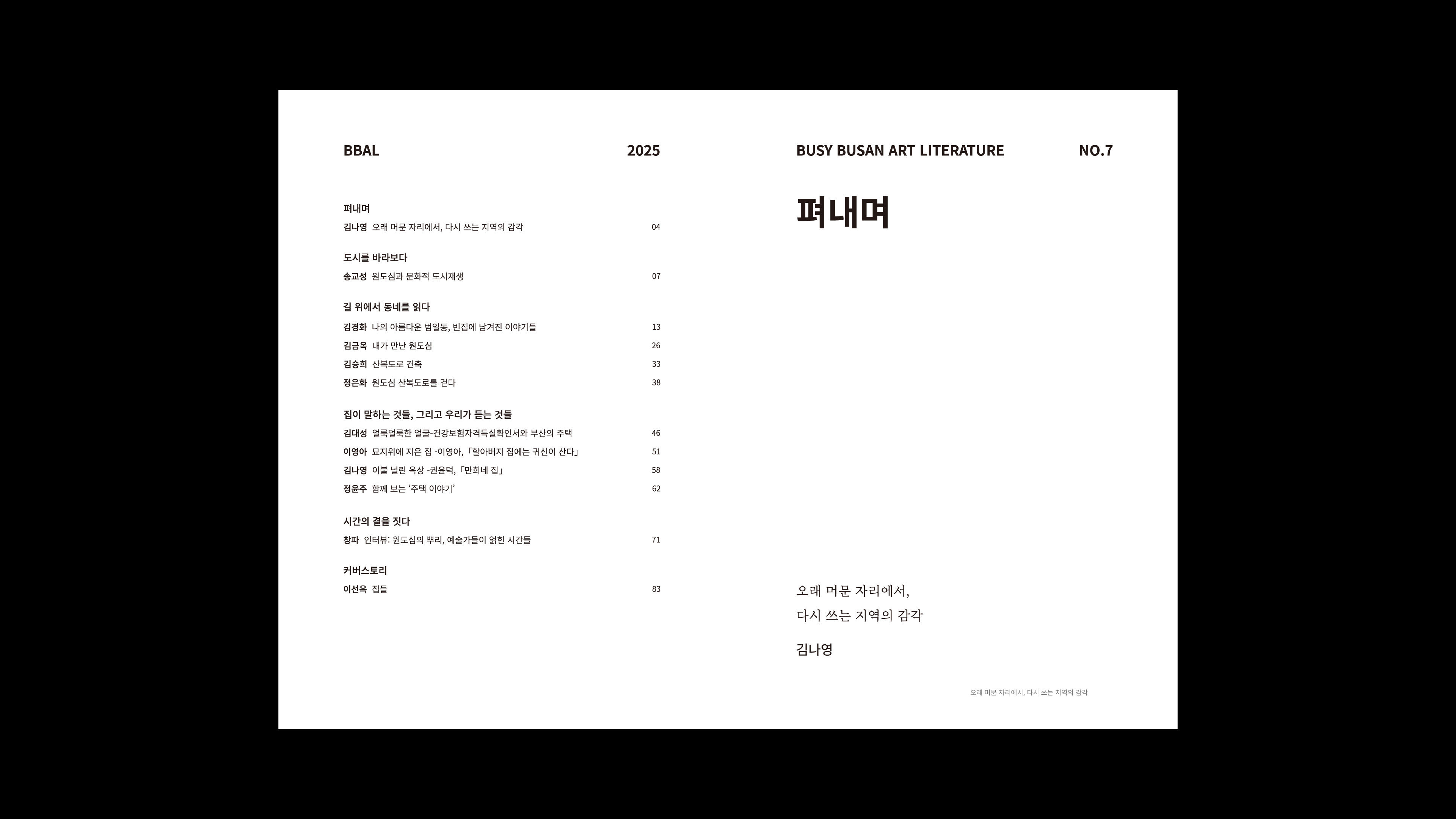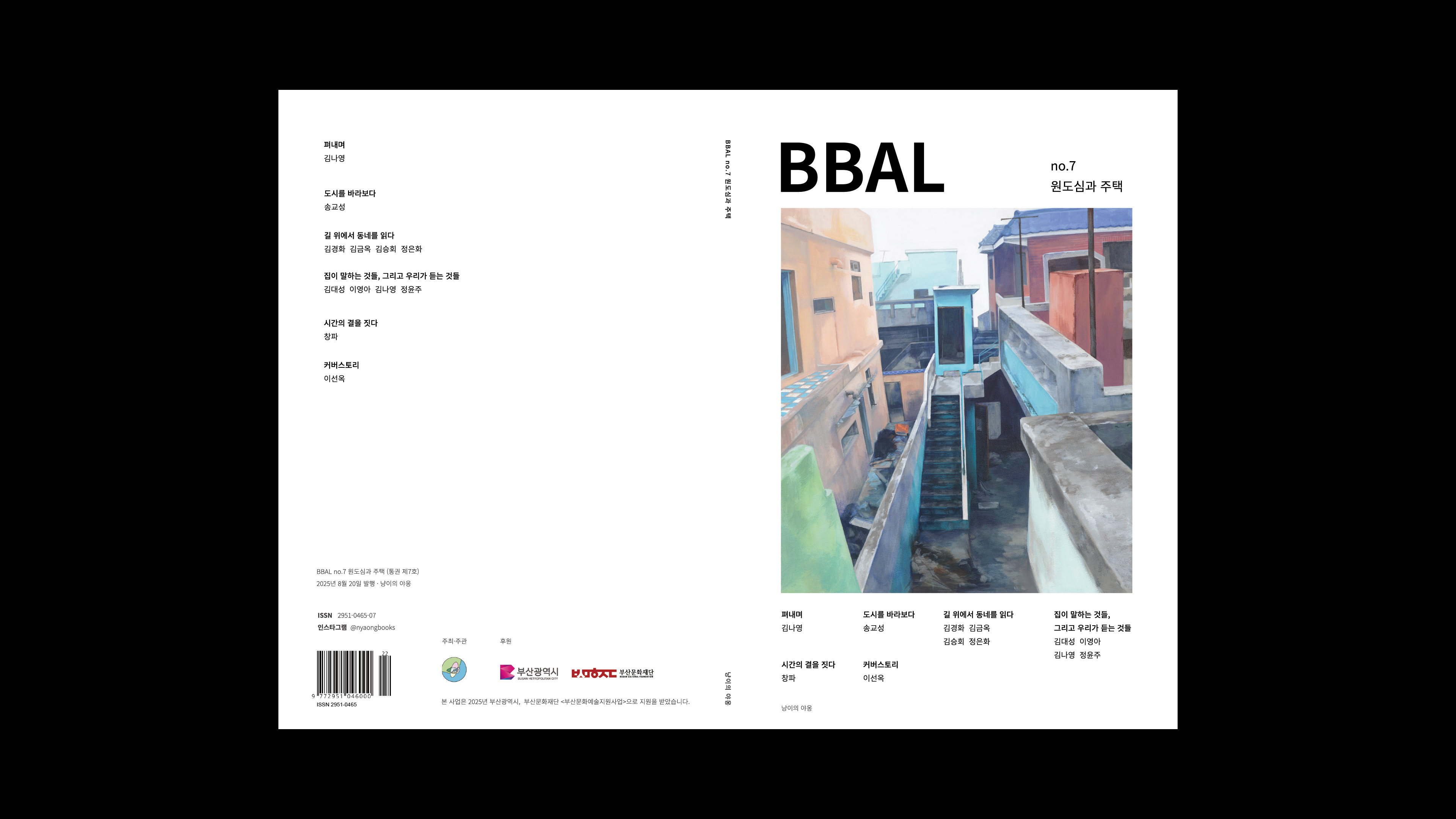 Busy Busan Art Literature(BBAL) 7호는 ‘원도심과 주택’을 키워드로 부산의 오래된 동네, 주거의 기억, 도시의 표면을 기록하는 아트&리터러처 퍼블리케이션입니다.