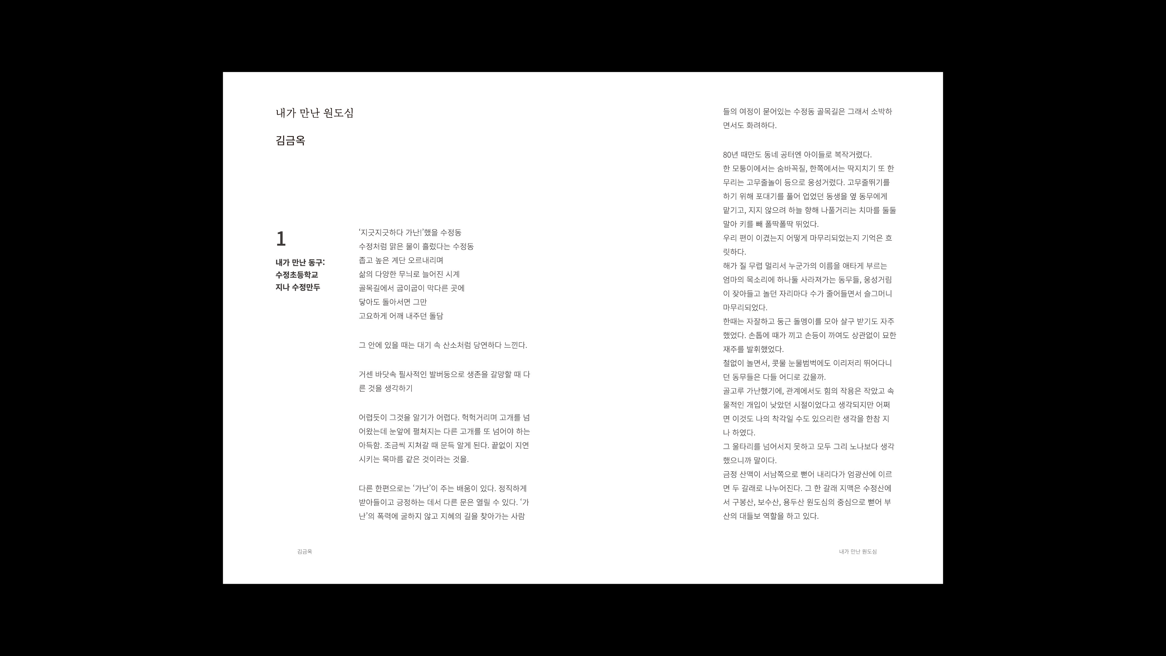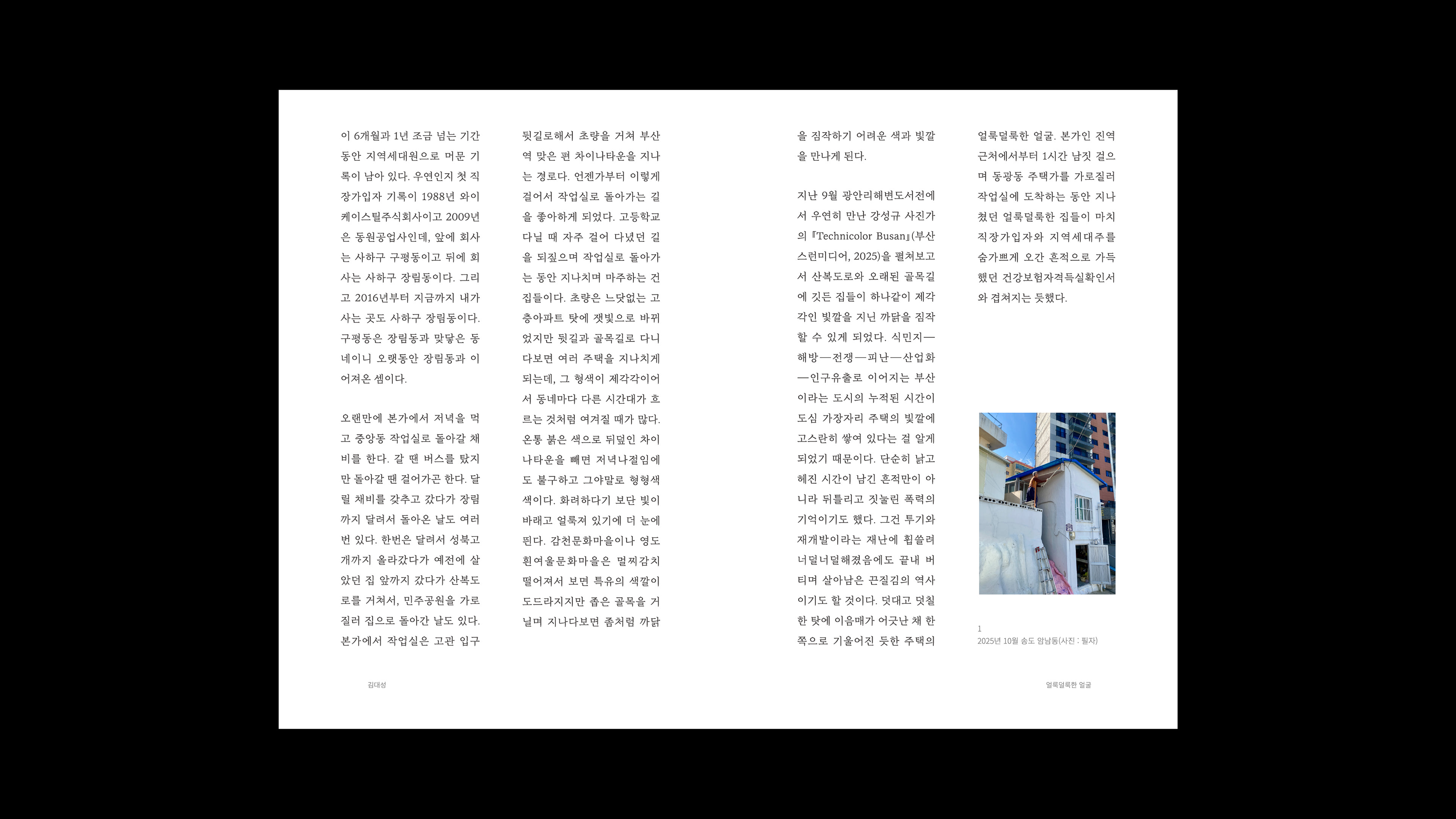 이번 호에서는 에세이/리서치 텍스트/사진 기록/인터뷰/커버스토리까지 서로 결이 다른 원고를 한 권의 리듬으로 묶는 편집 디자인 시스템을 구축했습니다.