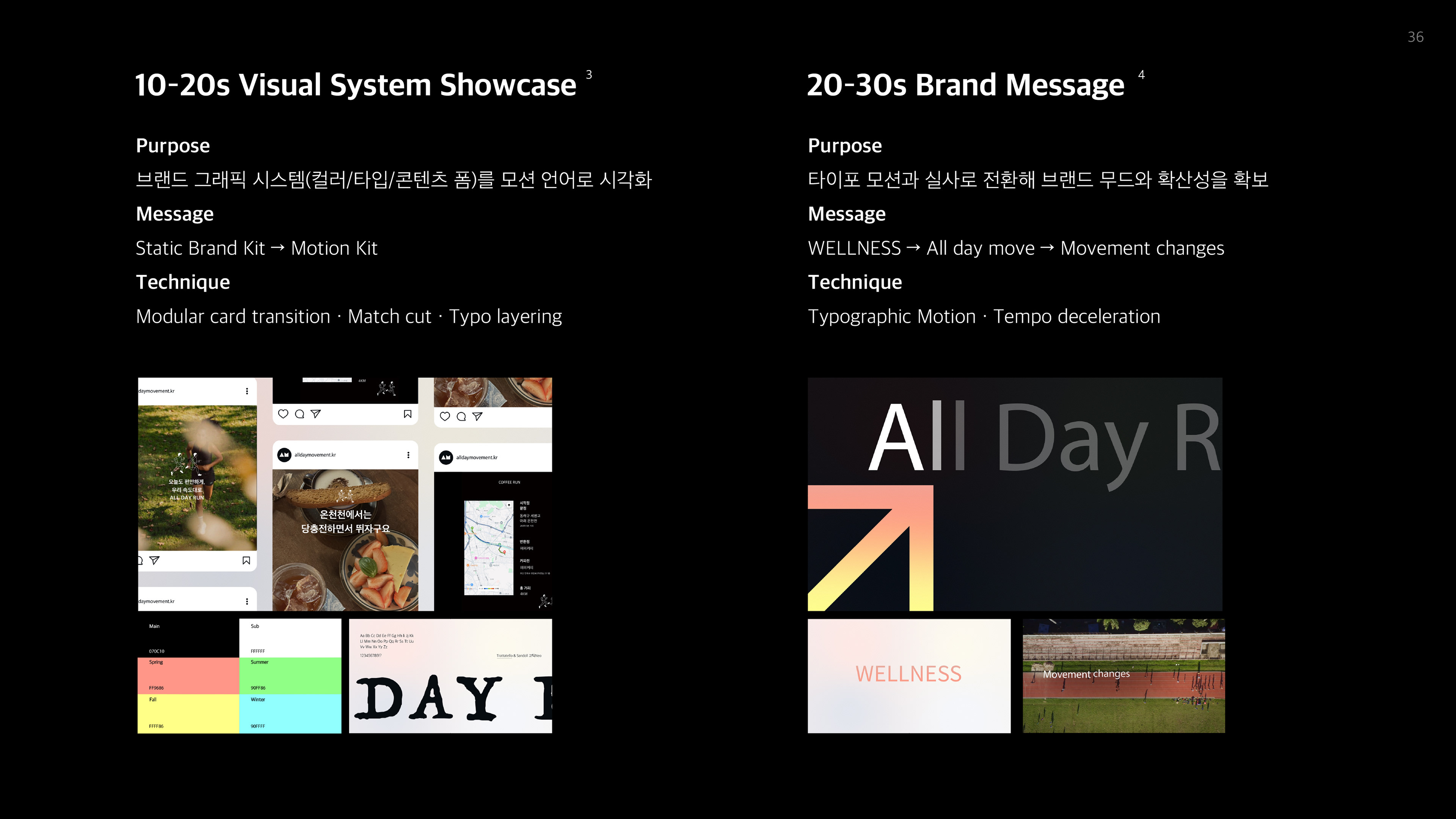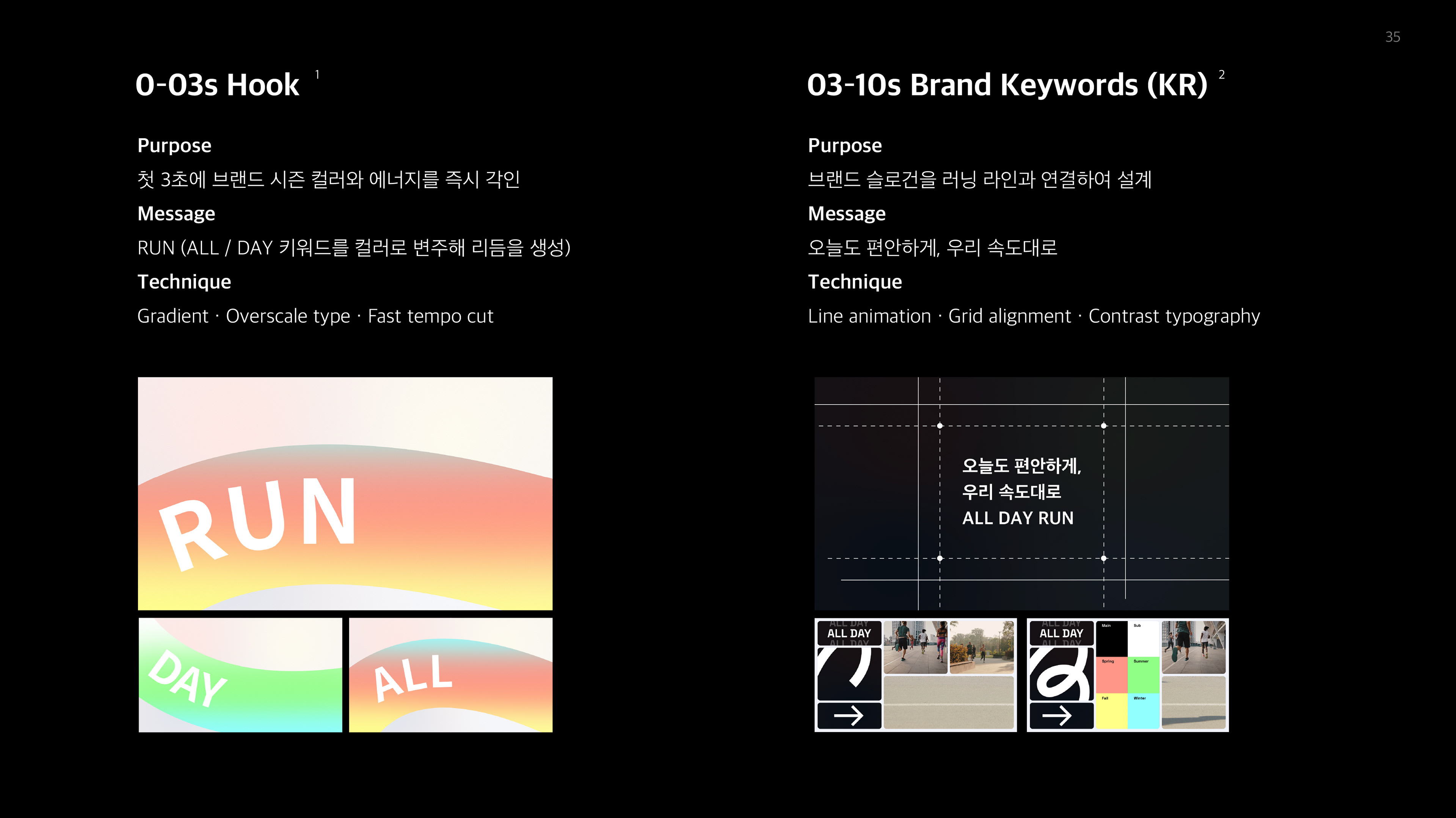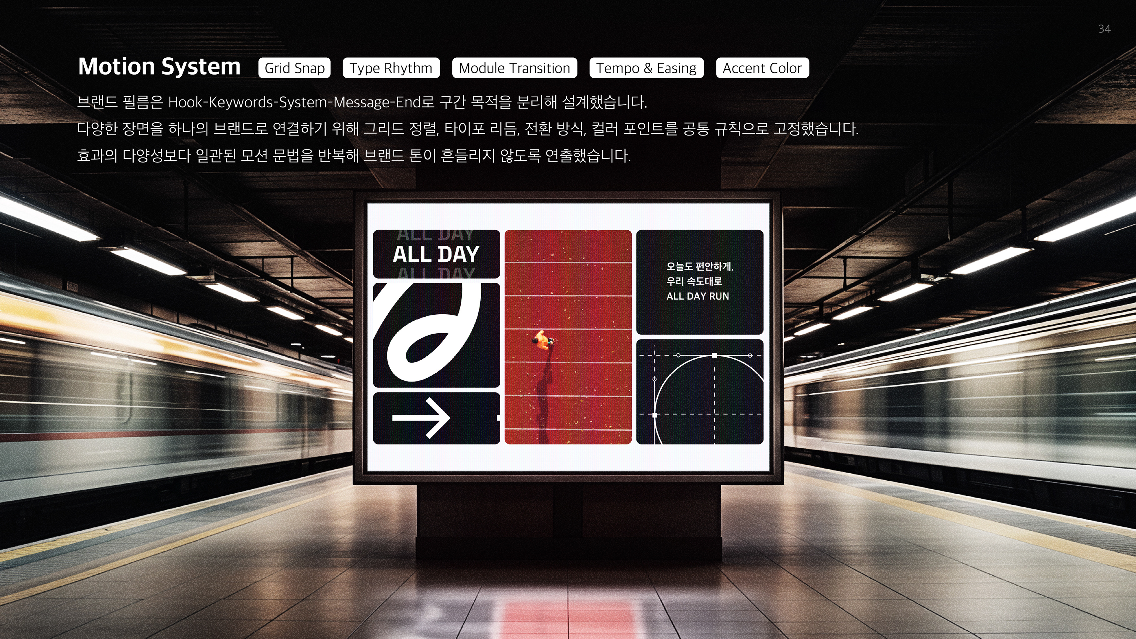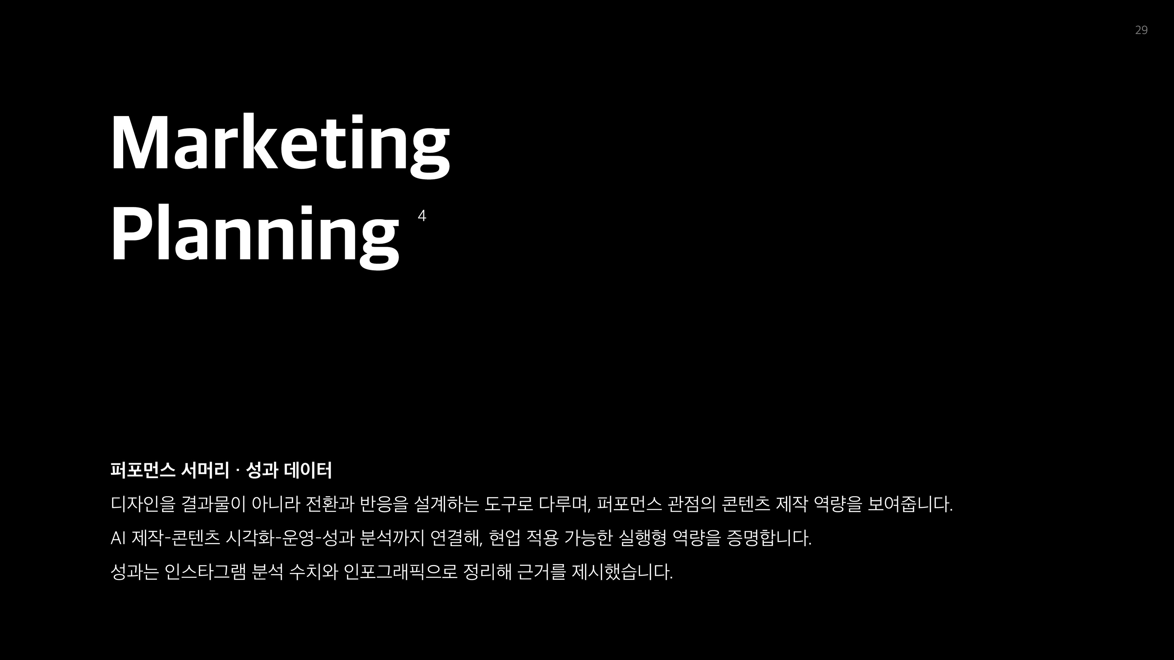 콘텐츠는 감도 유지뿐 아니라 도달–반응–전환을 만드는 도구로 보고, 실행 가능한 포맷으로 시각화했습니다. 브랜드 메시지가 실제 성과로 연결되도록 기획–운영–분석을 한 흐름으로 묶은 파트입니다.