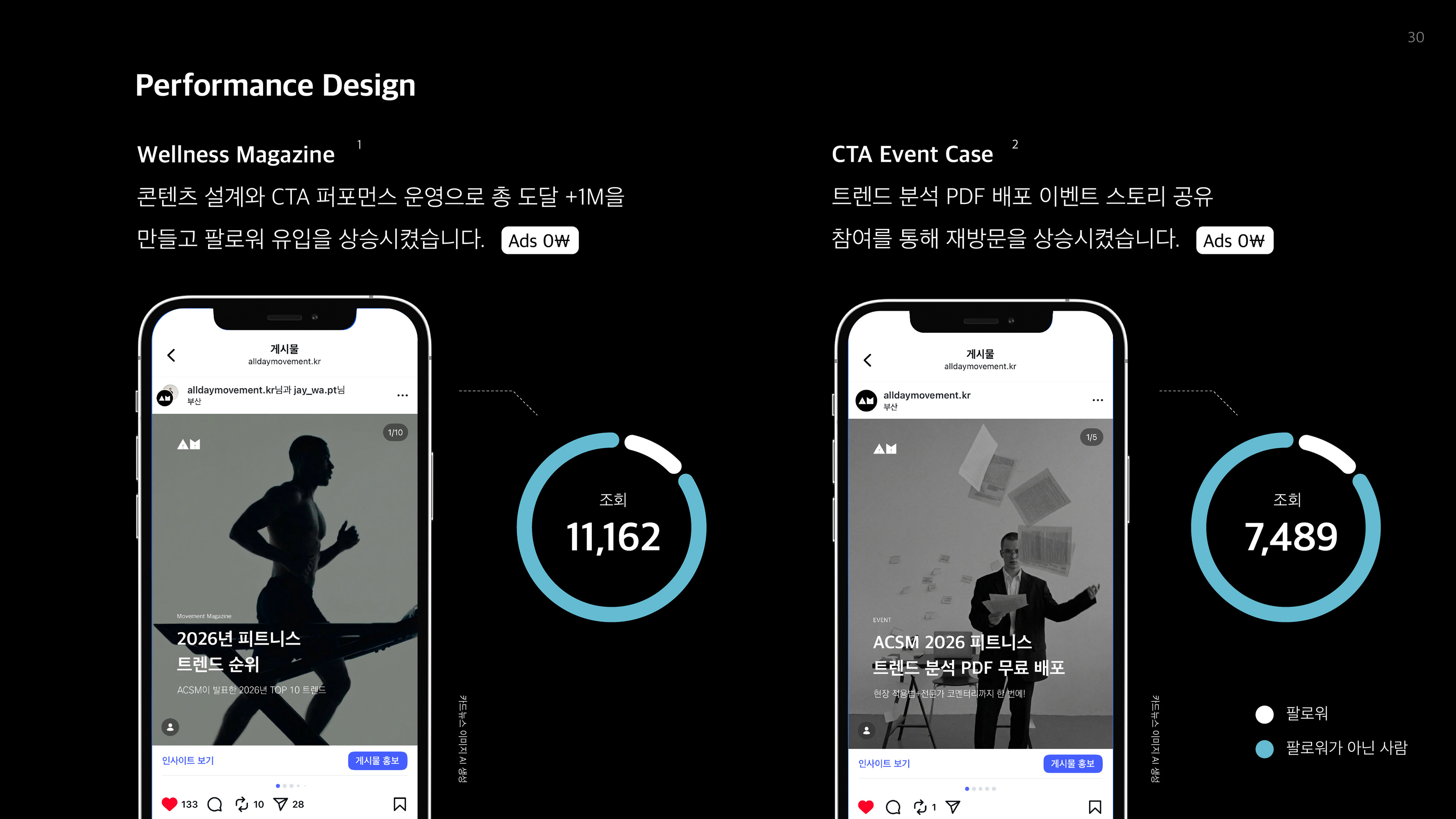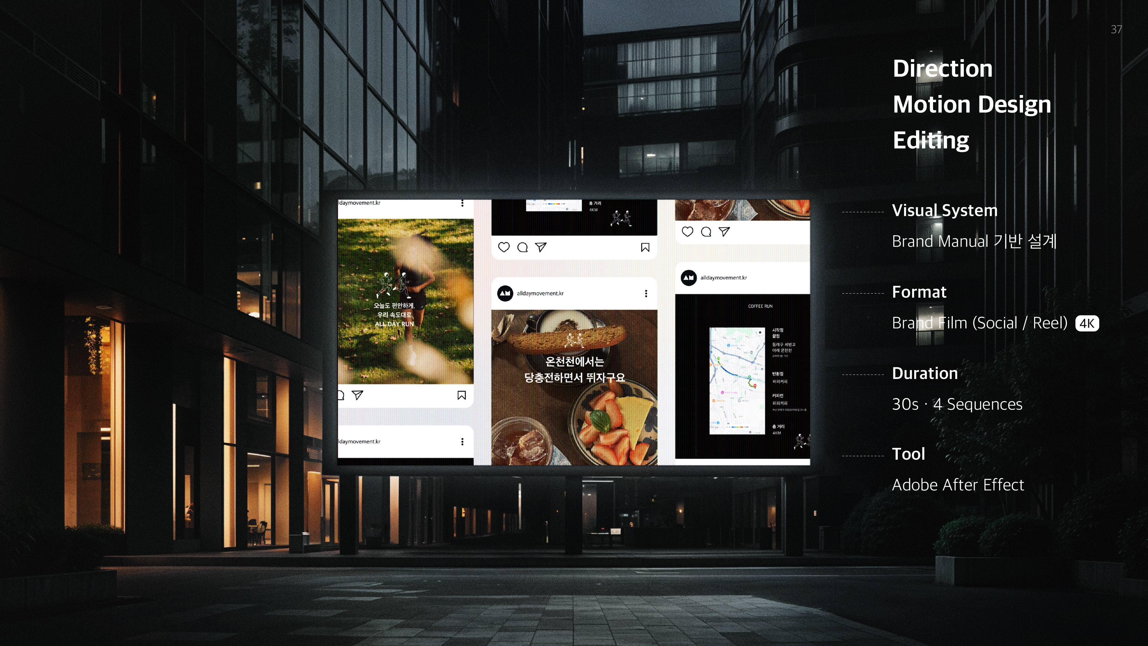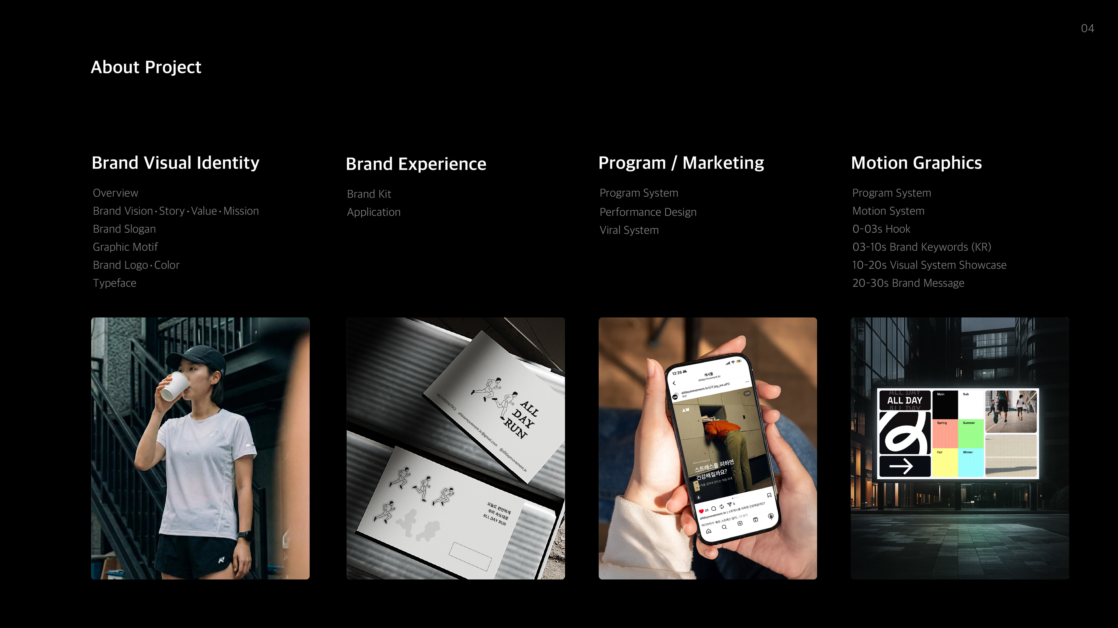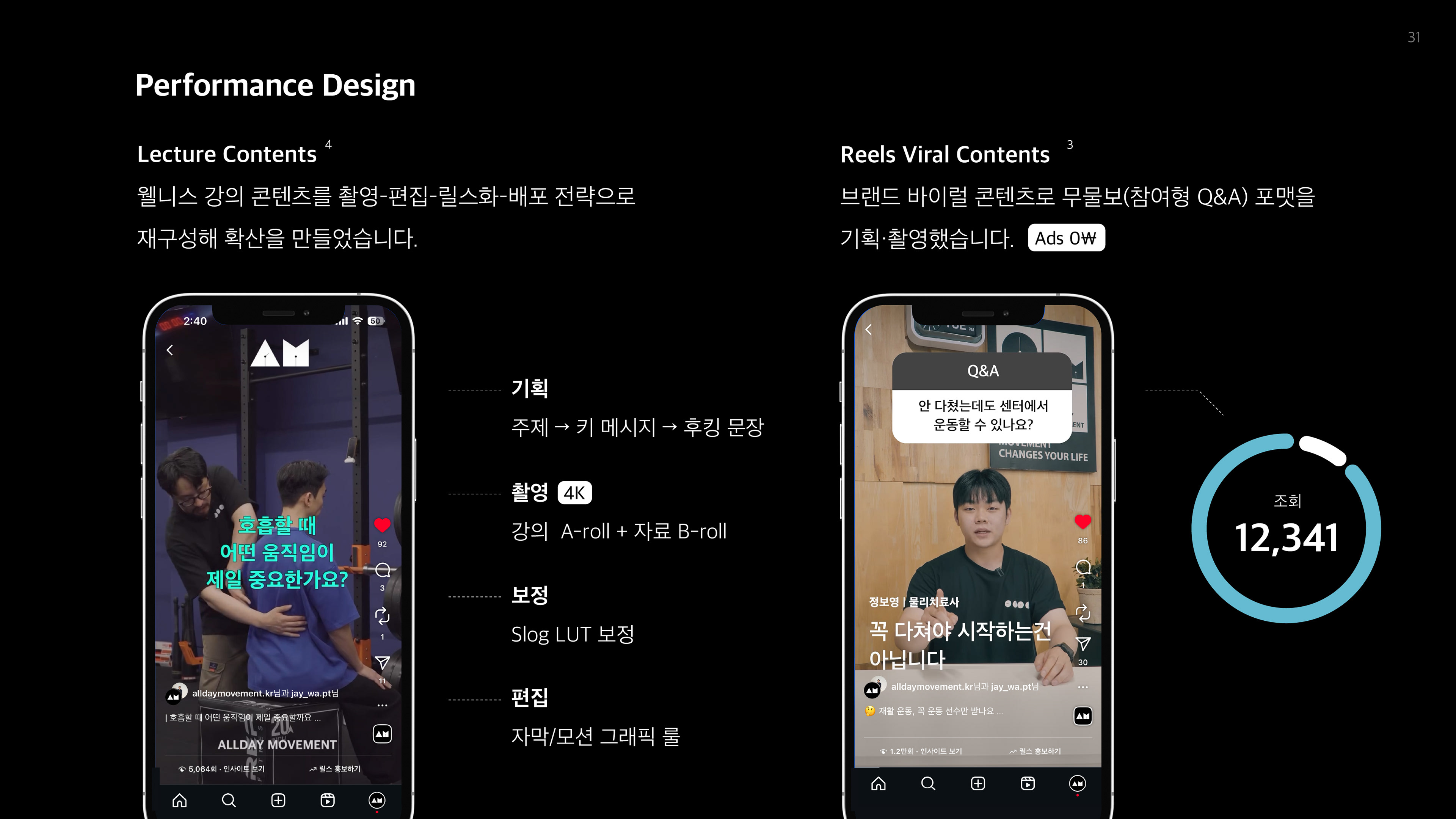 콘텐츠는 감도 유지뿐 아니라 도달–반응–전환을 만드는 도구로 보고, 실행 가능한 포맷으로 시각화했습니다. 브랜드 메시지가 실제 성과로 연결되도록 기획–운영–분석을 한 흐름으로 묶은 파트입니다.