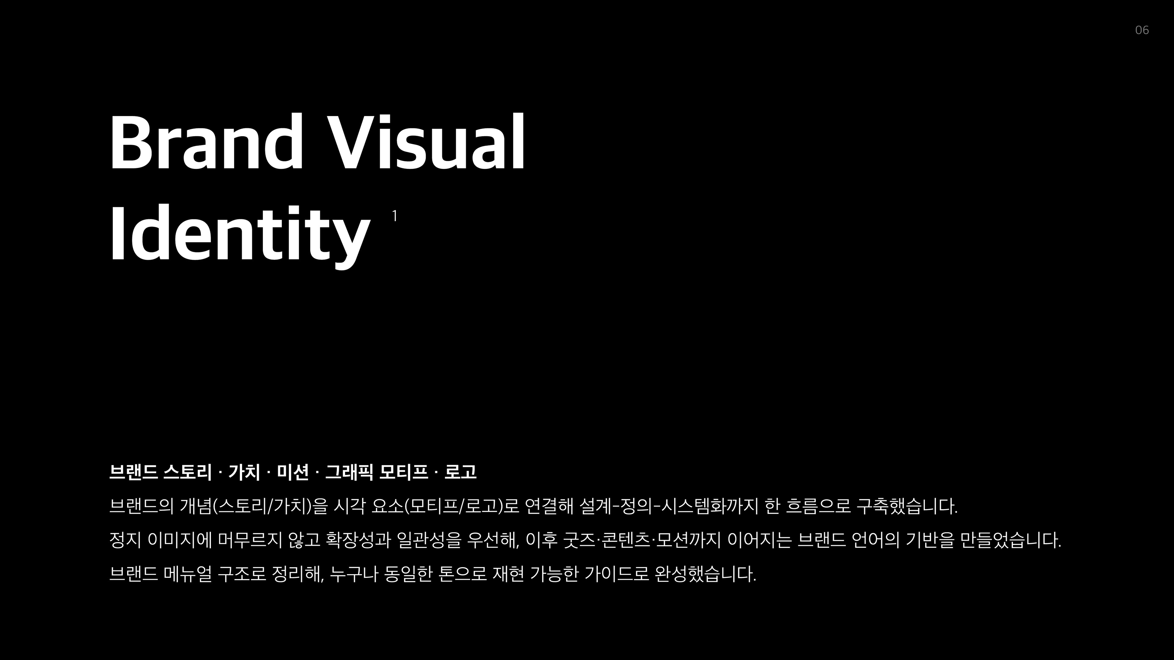 예쁜 로고를 만드는 데서 끝나지 않도록, 운영자가 같은 톤으로 재현할 수 있는 규칙과 구조를 먼저 설계했습니다. 브랜드의 첫인상이 흔들리지 않도록 언어(시스템)부터 정리한 파트입니다.