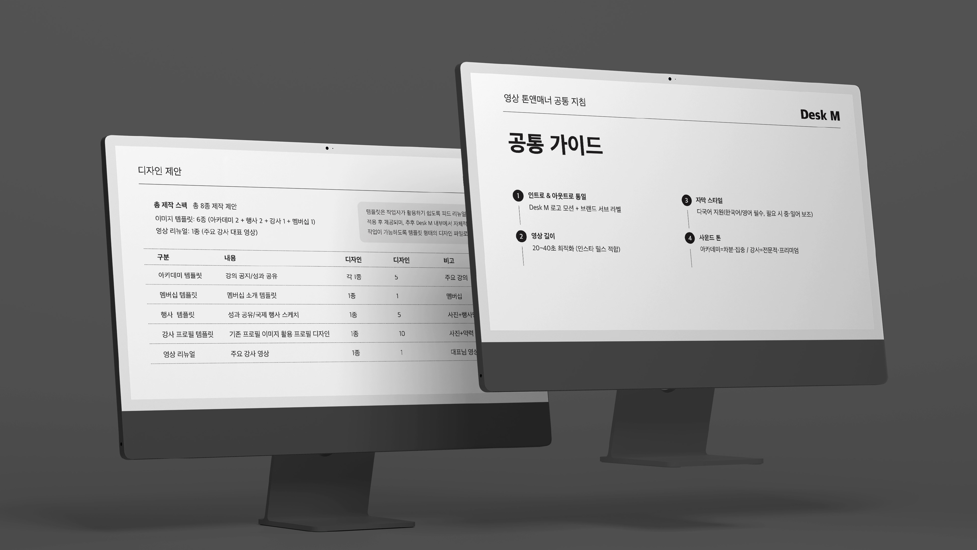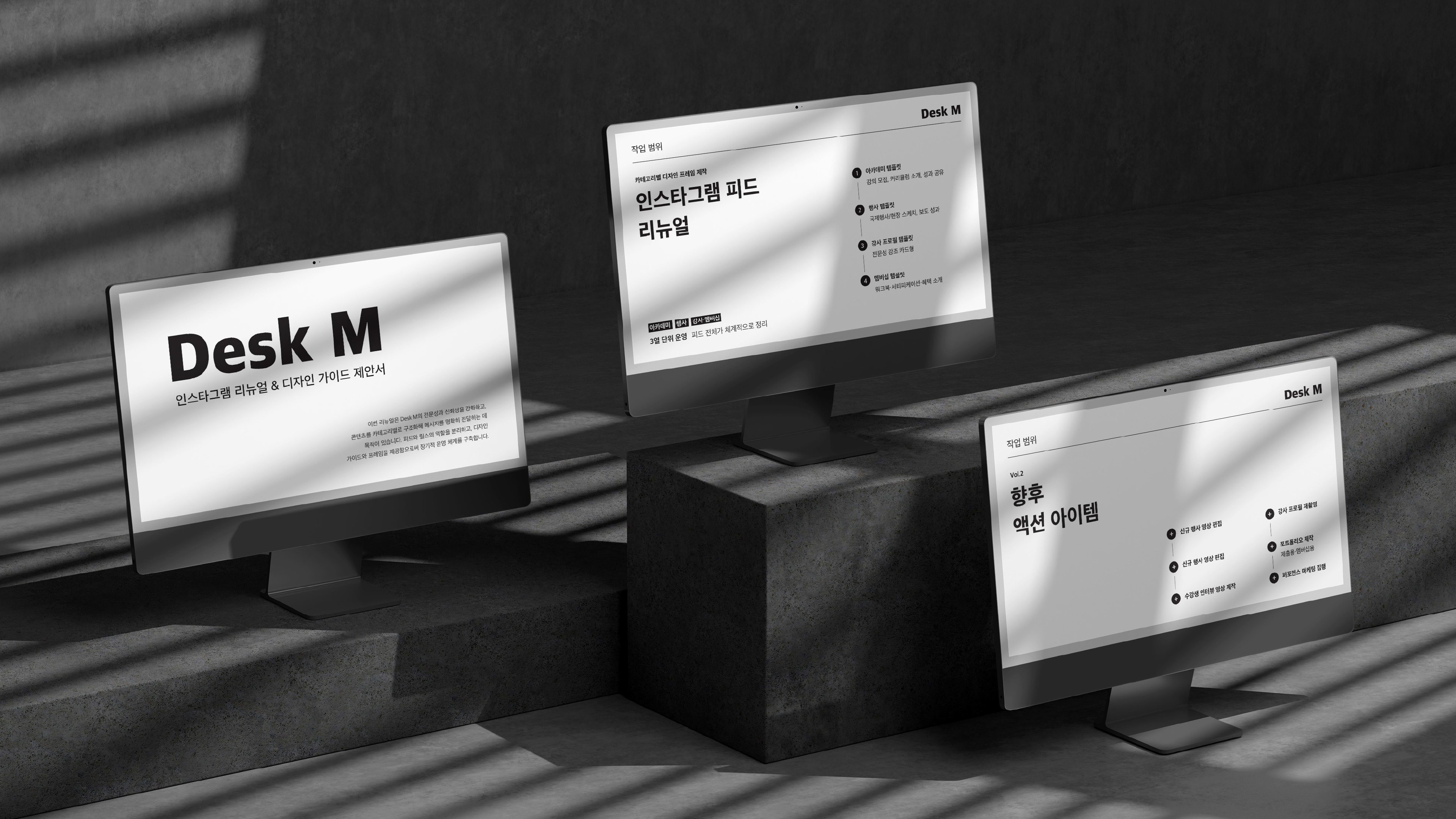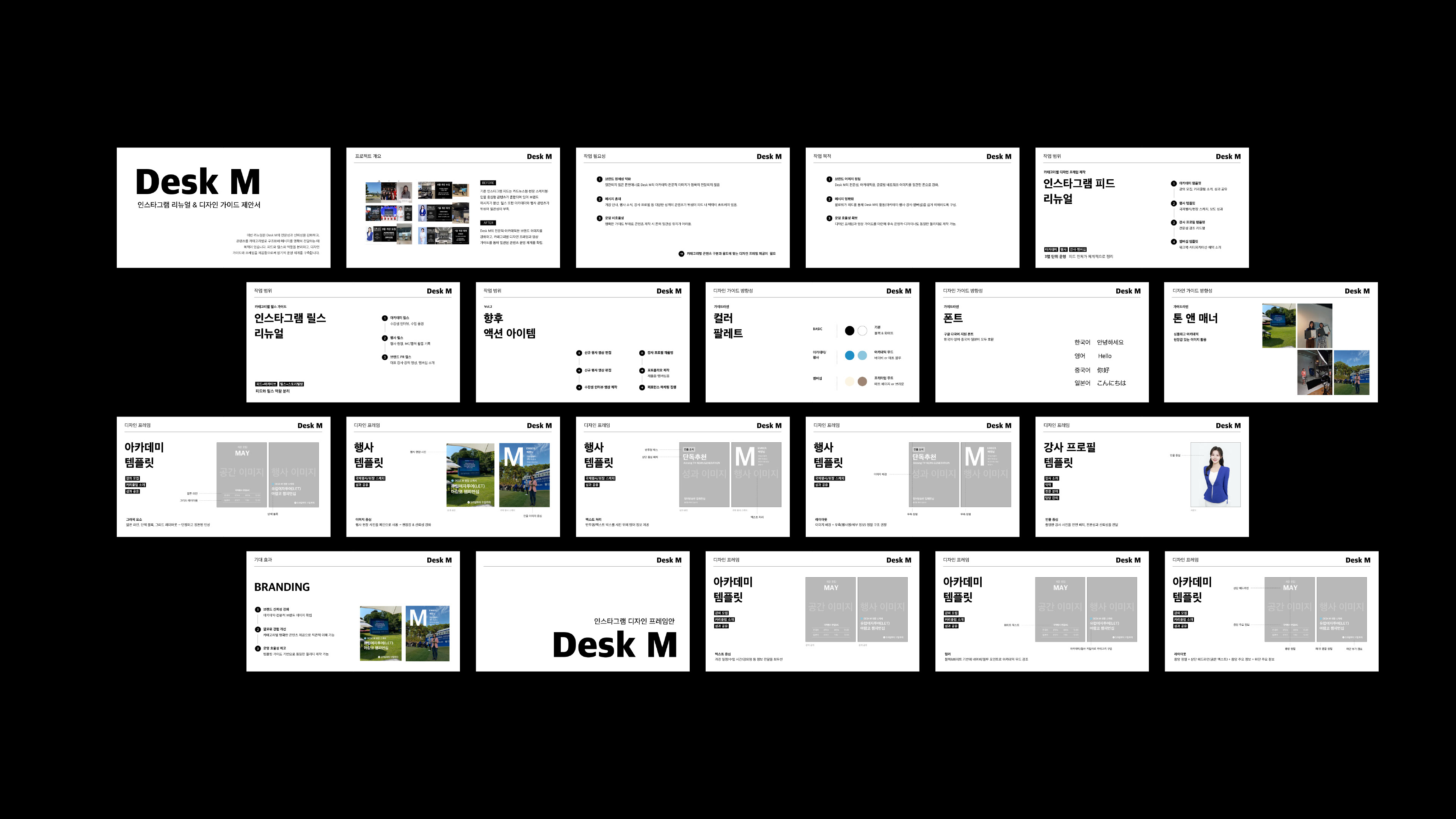 DeskM의 인스타그램 채널 운영 전반을 정돈하기 위해 피드/릴스 리뉴얼 방향과 디자인 가이드라인(톤앤매너·컬러·폰트·템플릿 시스템)을 제안한 프로젝트입니다.